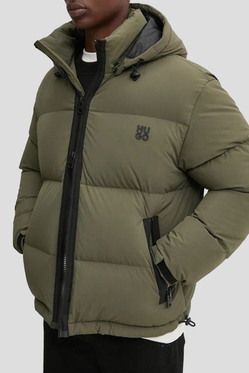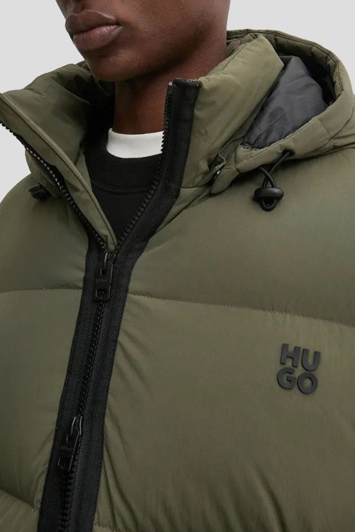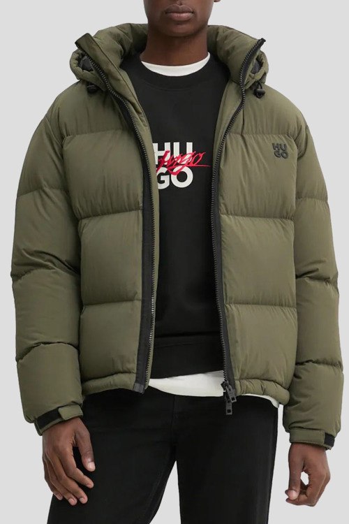 Детали: Мужская куртка Bironto цвета хаки из полиамида от Hugo by Hugo Boss (Хуго бай Хуго Босс). Стеганый дизайн, высокий воротник-стойка, съемный капюшон, застежка на молнию, фактурный логотип бренда на груди, утепленная модель миксом из пуха и пера