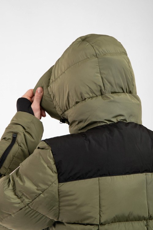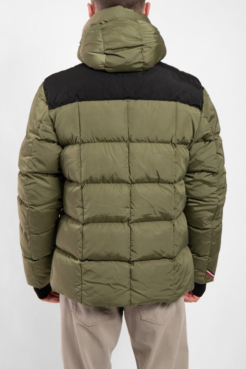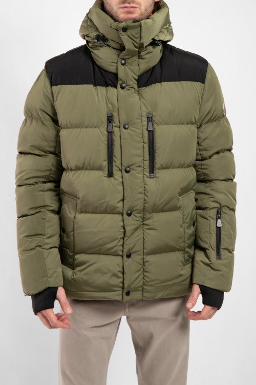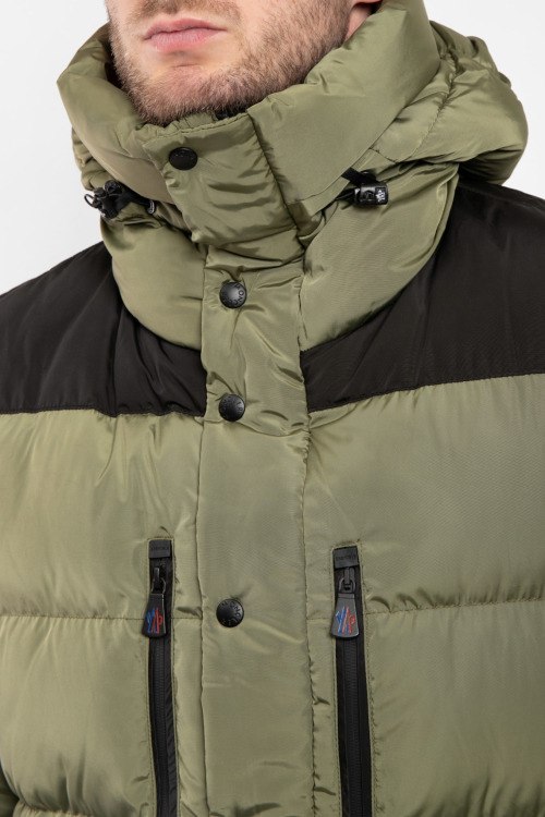 Мужская куртка цвета хаки на пуху от Moncler (Монклер). Модель из линейки Moncler Grenoble, стеганый дизайн, высокий воротник, вшитый капюшон, нашивка с логотипом на рукаве, четыре кармана, один карман на рукаве, застежка на кнопки, трикотажные манжеты с вырезом для большого пальца, классическая длина, наполнитель из микса пуха и пера.