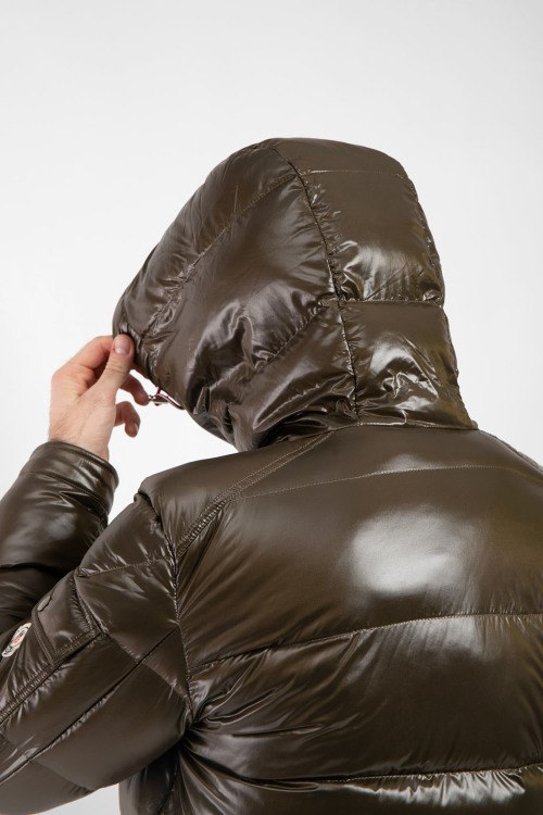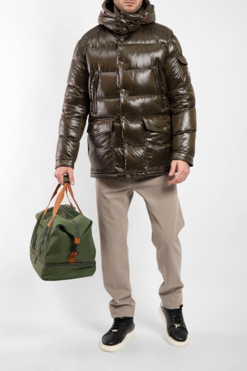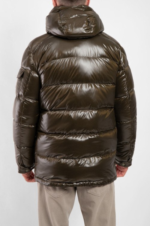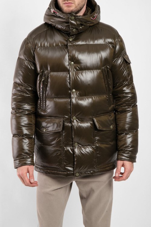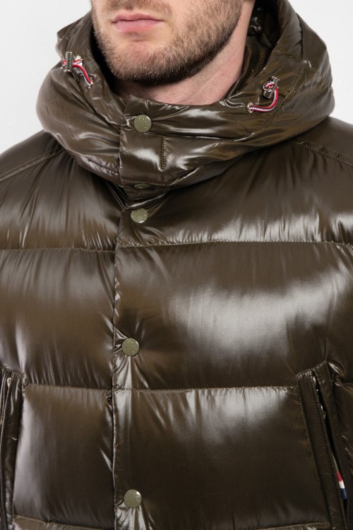 Мужская куртка на пуху цвета темного хаки от Moncler (Монклер). Стеганый дизайн, высокий воротник, вшитый капюшон, логотип на рукаве, четыре передних кармана, застежка на кнопки, классическая длина, наполнитель из микса пуха и пера.
