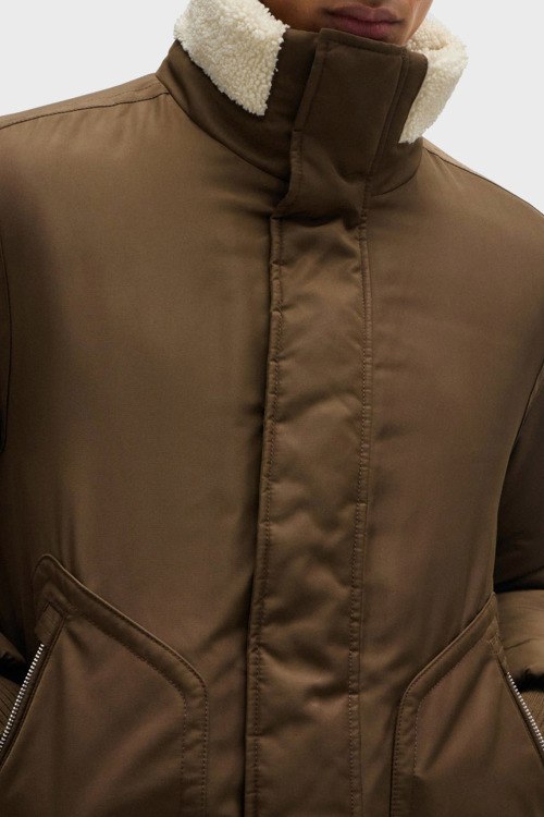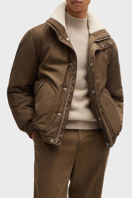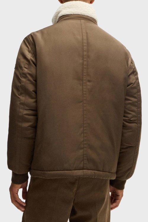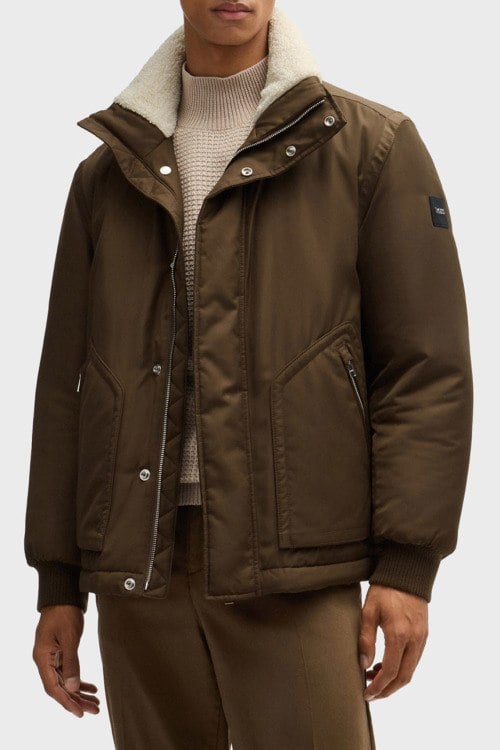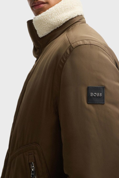 Мужская коричневая куртка из полиэстера от Hugo Boss (Хуго Босс). Высокий воротник-стойка с меховым отворотом, застежка на молнию и кнопки, патч-лого, прорезные карманы на молнии, модель утепленная мехом