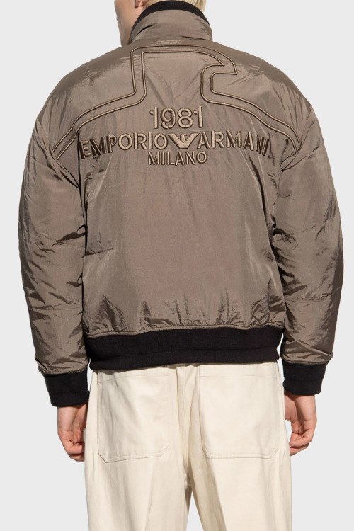 Детали: Мужская коричнево-черная куртка на пуху от Emporio Armani (Эмпорио Армани). Вышитый логотип, высокий воротник, боковые карманы на молнии, застежка-молния, классическая длина, трикотажные манжеты и нижний край, наполнитель из микса пуха и пера