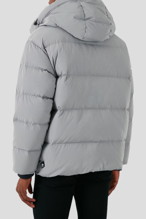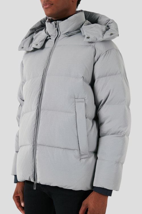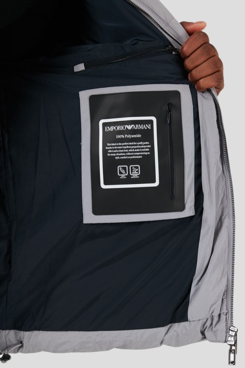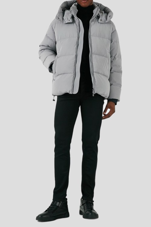Детали: Мужская серая куртка на пуху от Emporio Armani (Эмпорио Армани). Стеганый дизайн, высокий воротник, съемный капюшон, боковые карманы, застежка-молния, классическая длина, наполнитель из микса пуха и пера