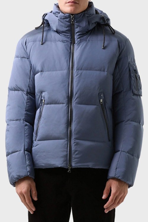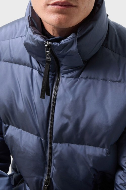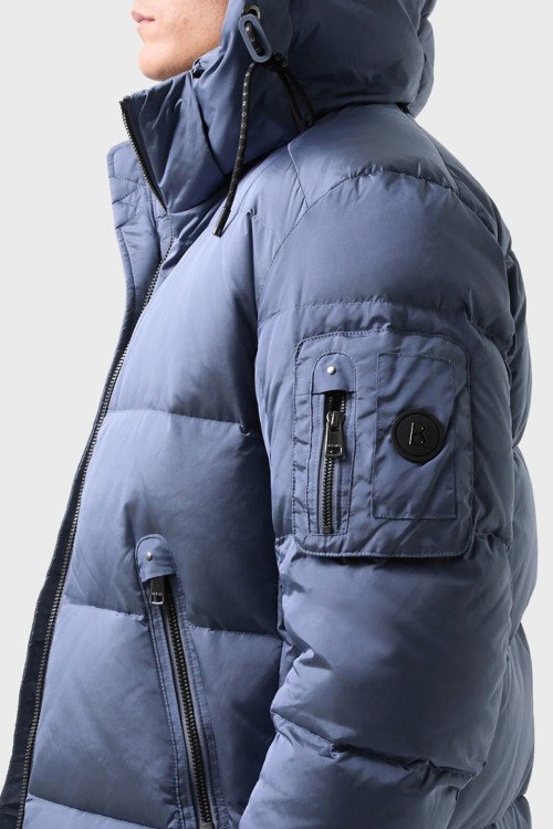 Детали: Мужская синяя куртка на пуху Jamy-D1 от Bogner (Богнер). Стеганый дизайн, высокий воротник, вшитый капюшон, нашивка с логотипом на рукаве, боковые карманы на молнии, застежка-молния, классическая длина, пуховый наполнитель