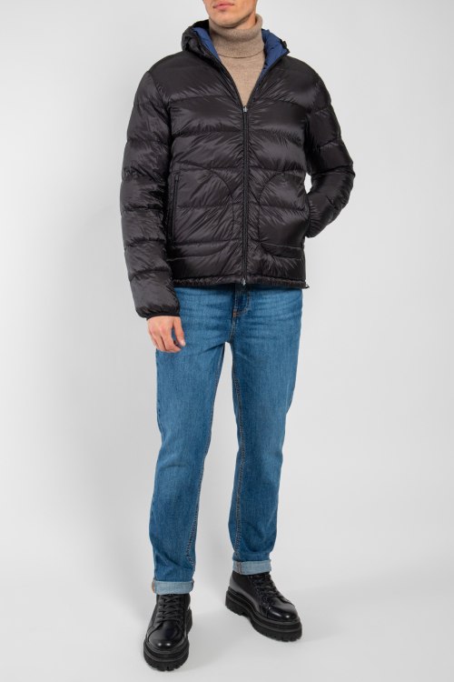 Мужская куртка из полиамида от Herno (Эрно). Стеганый дизайн, двухсторонняя модель, одна сторона синего цвета, другая сторона черная, высокий воротник-стойка, вшитый капюшон с утяжкой, застегивается на молнию, прорезные боковые карманы на молнии, по низу изделия эластичная резинка с утяжкой, модель утепленная миксом из пуха и пера