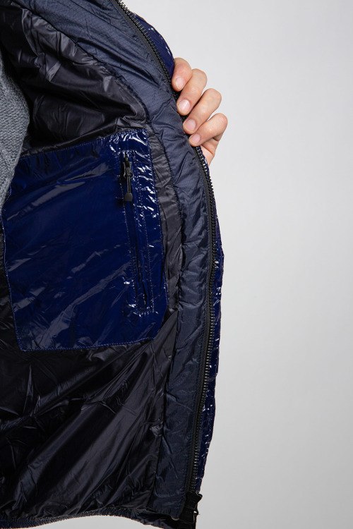 Детали: Мужская темно-синяя куртка из нейлона от Invicta (Инвикта). Стеганый дизайн, несъемная вставка на молнии с капюшоном, застежка на кнопки, внешние прорезные карманы и один внутренний, эластичные бретели, эластичная резинка на манжетах, нашивка с логотипом бренда