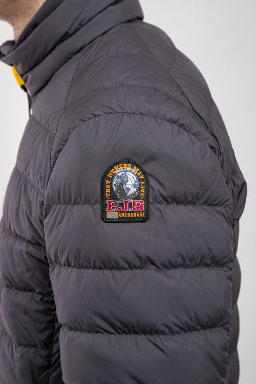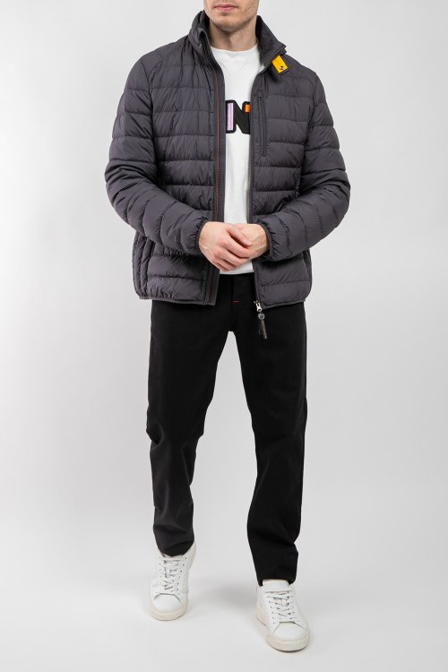 Мужская темно-серая куртка из полиэстера от Parajumpers (Параджамперс). Стеганый дизайн, застежка на молнию, воротник-стойка, три внешних кармана, один внутренний карман, патч-лого, модель утепленная пухом.