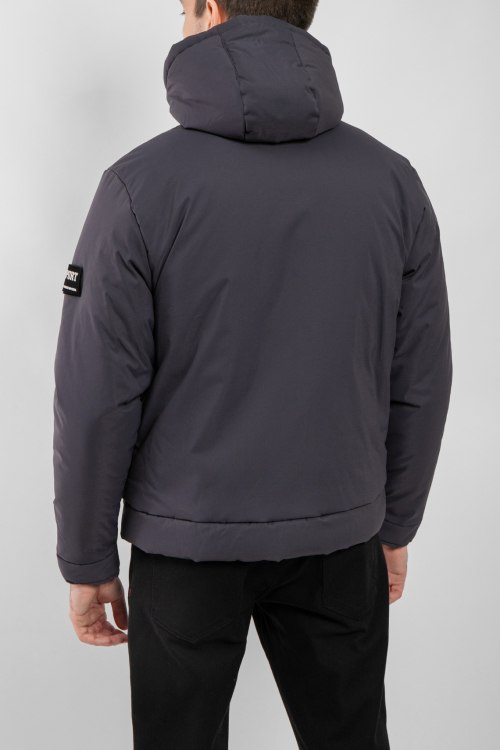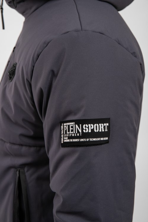Мужская темно-серая куртка из полиэстера от Plein Sport (Плейн Спорт). Застежка на молнию, высокий воротник-стойка, вшитый капюшон, дополнительный воротник на кнопках с логотипом бренда, три внешних кармана на молнии, патч-лого на груди, нашивка с лого на рукаве, модель утепленная синтепоном.