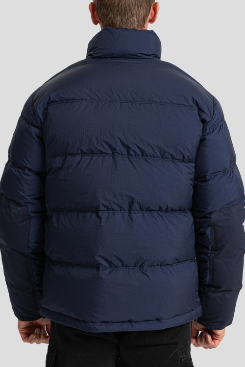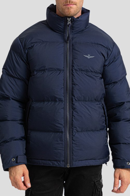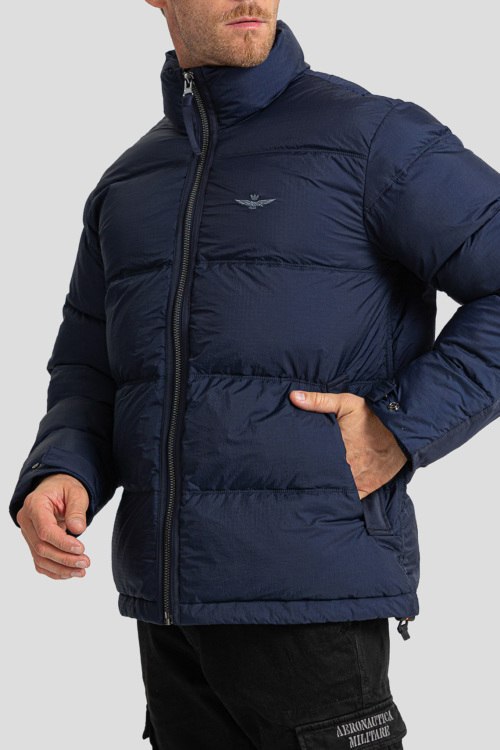Детали: Мужская темно-синяя куртка из полиэстера от Aeronautica Militare (Аэронавтика Милитари). Стеганый дизайн, высокий воротник-стойка, застежка на молнию, вышитый логотип бренда, модель утепленная синтепоном, прорезные карманы, эластичная резинка по низу изделия