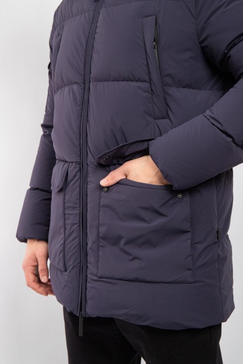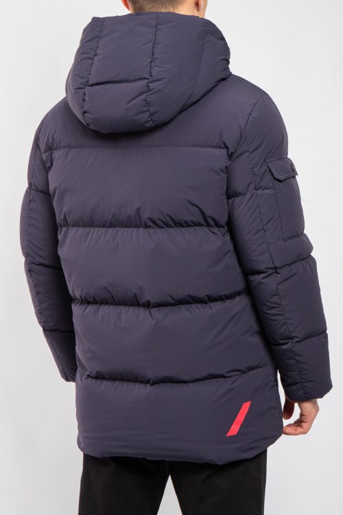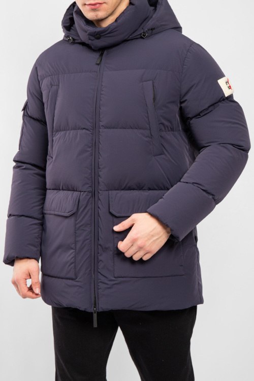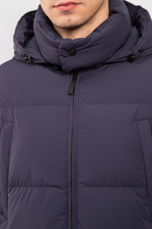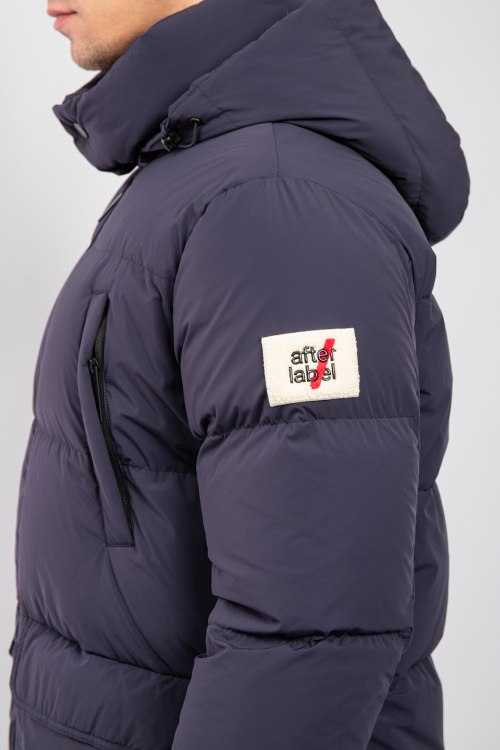 Детали: Мужская темно-синяя куртка на пуху от After Label (Афтер Лейбл). Стеганый дизайн, высокий воротник, съемный капюшон, нашивка с логотипом на рукаве, четыре кармана, застежка-молния, удлиненная длина, наполнитель из микса пуха и пера