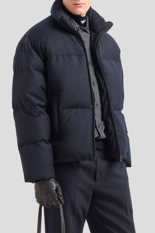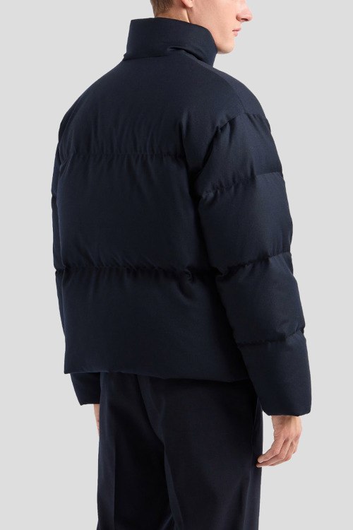 Детали: Мужская темно-синяя куртка из натуральной шерсти и вискозы от Emporio Armani (Эмпорио Армани). Стеганый дизайн, высокий воротник-стойка, застежка на молнию, модель утепленная миксом из пуха и пера, прорезные карманы