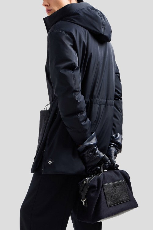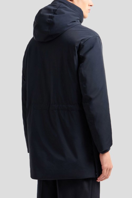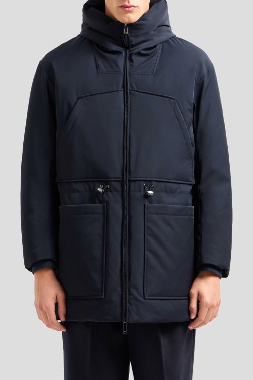 Детали: Мужская темно-синяя куртка из полиамида и эластана от Emporio Armani (Эмпорио Армани). Высокий воротник-стойка, застежка на молнию, вшитый капюшон, удлиненная куртка, пояс в кулиской, четыре кармана, модель утепленная миксом из пуха и пера
