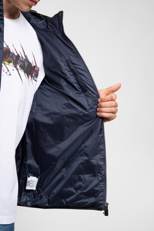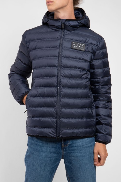 Мужская темно-синяя куртка из полиэстера от EA7 Emporio Armani (ЕА7 Эмпорио Армани). Стеганый дизайн, высокий воротник-стойка, застежка на молнию, вшитый капюшон, патч-лого, боковые карманы на молнии, внутренний карман на молнии, модель утепленная миксом из пуха и пера.