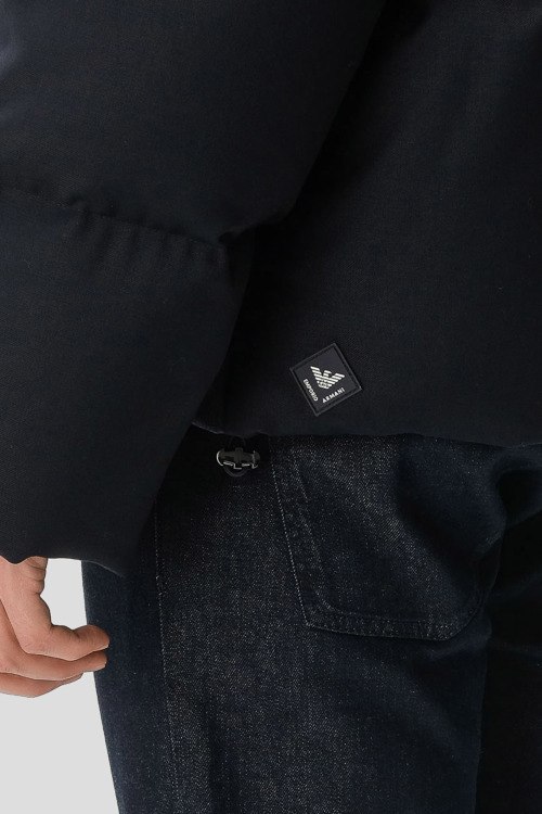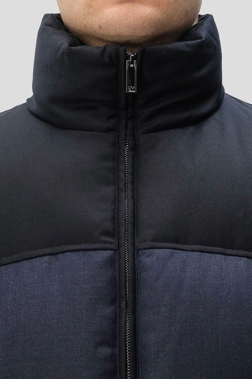 Детали: Мужская темно-синяя куртка из полиамида и полиэстера от Emporio Armani (Эмпорио Армани). Стеганый дизайн, высокий воротник-стойка, застежка на молнию, прорезные карманы, модель утепленная миксом из пуха