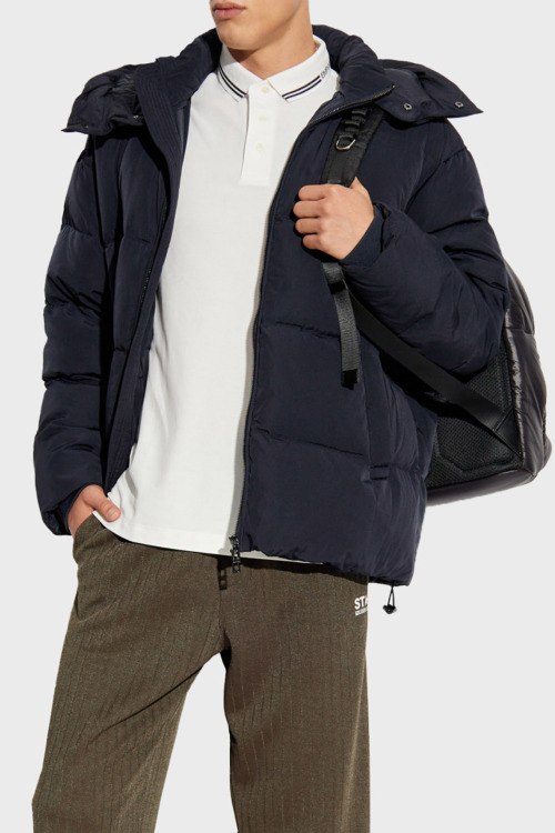Детали: Мужская темно-синяя куртка из полиэстера от Emporio Armani (Эмпорио Армани). Стеганый дизайн, высокий воротник-стойка, застежка на молнию, съемный капюшон, прорезные карманы, модель утепленная миксом из пуха и пера
