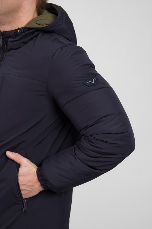 Детали: Мужская куртка из полиэстера от Armata di Mare (Армата ди Маре). Двухсторонняя модель, высокий воротник-стойка, застежка на молнию, прорезные карманы на молнии, патч-лого на рукаве, манжеты с эластичной резинкой, модель утепленная синтепоном