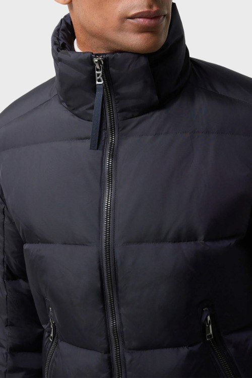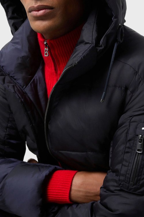 Детали: Мужская темно-синяя куртка на пуху Jamy-D1 от Bogner (Богнер). Стеганый дизайн, высокий воротник, вшитый капюшон, нашивка с логотипом на рукаве, боковые карманы на молнии, застежка-молния, классическая длина, пуховый наполнитель