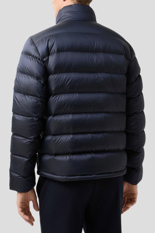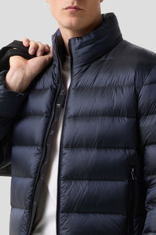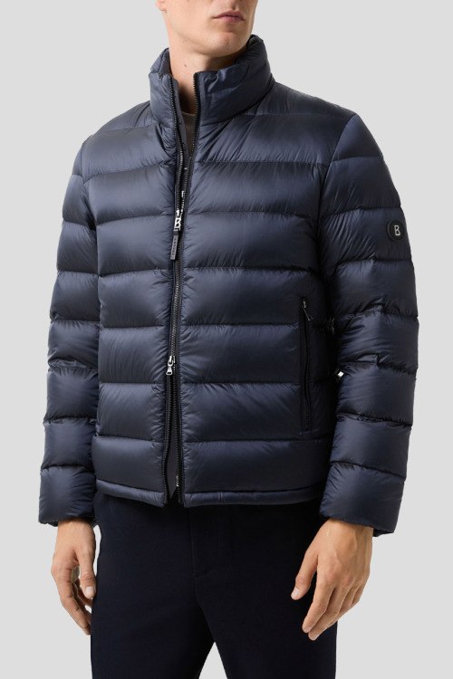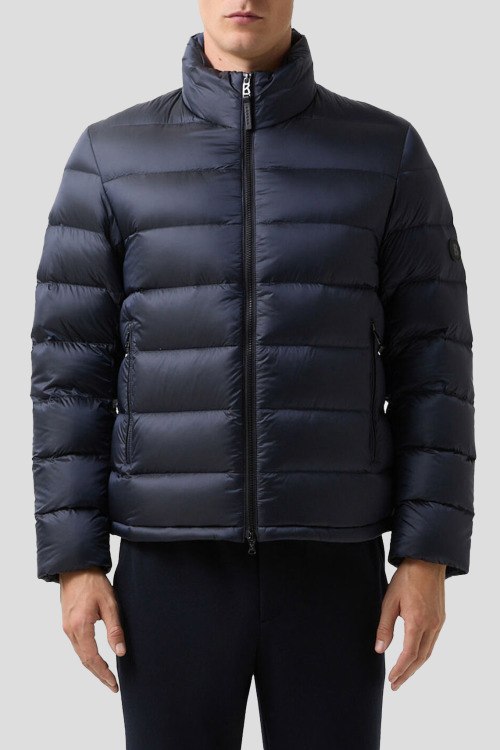 Детали: Мужская темно-синяя куртка на пуху Hugh от Bogner (Богнер). Стеганый дизайн, высокий воротник, нашивка с логотипом на рукаве, боковые карманы на молнии, застежка-молния, классическая длина, наполнитель из микса пуха и пера