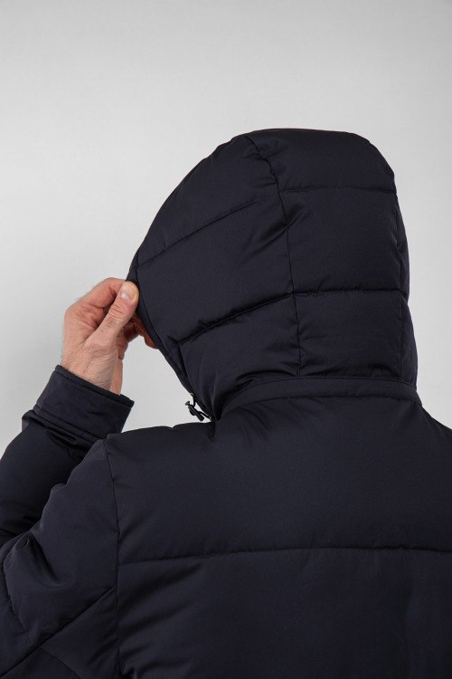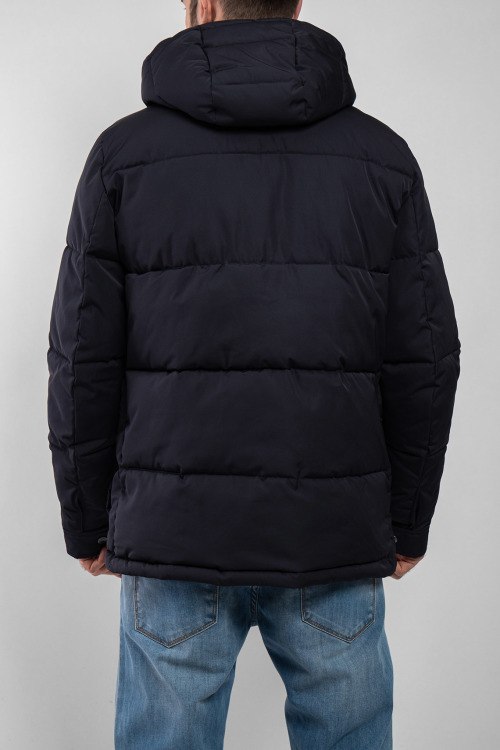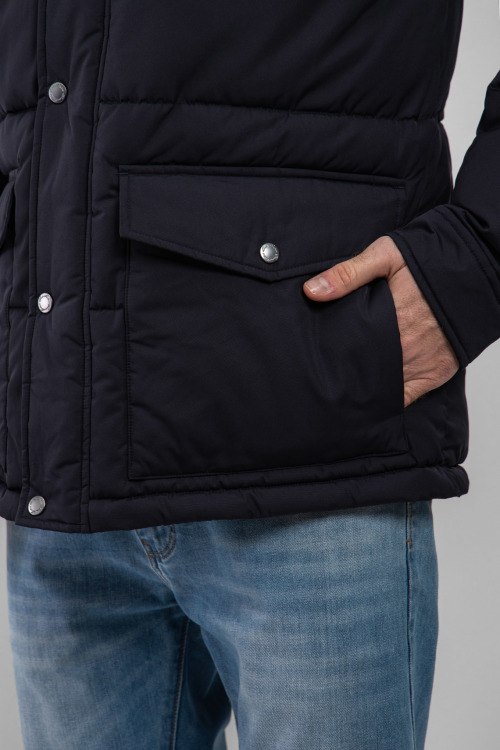 Мужская темно-синяя куртка из полиэстера от Brooks Brothers (Брукс Бразерс). Стеганый дизайн, высокий воротник-стойка, застежка на молнию и кнопки, четыре кармана, один внутренний карман, съемный капюшон с утяжкой, модель утепленная синтепоном.