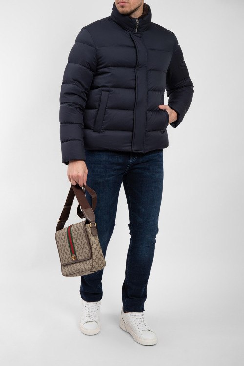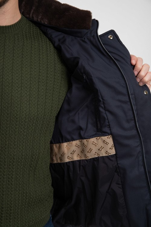 Мужская темно-синяя куртка из полиэстера от Herno (Эрно). Стеганая куртка, высокий воротник-стойка, меховая отделка, застежка на молнию и пуговицы, боковые карманы, внутренний карман, утепленная гусиным пухом.
