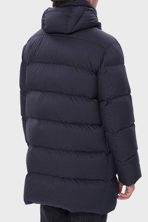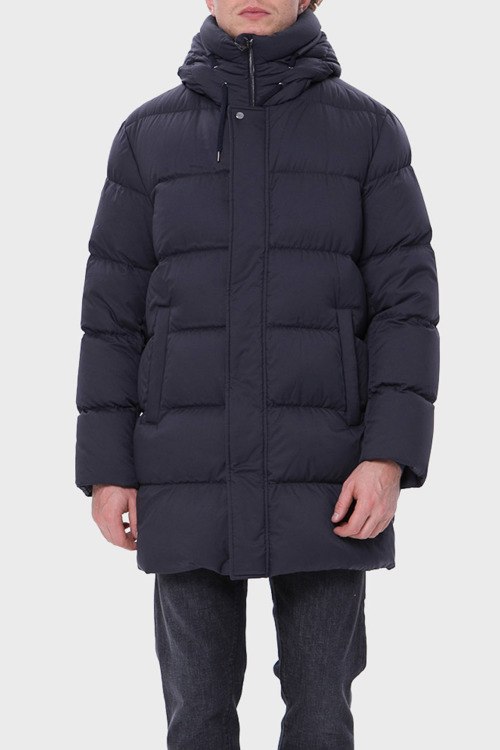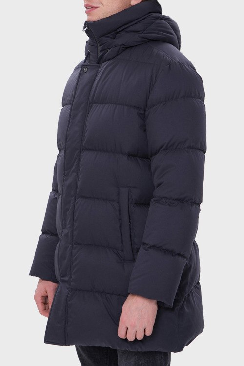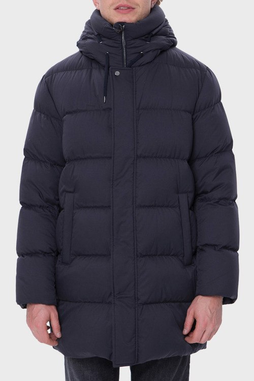 Детали: Мужская темно-синяя куртка из полиэстера от Herno (Эрно). Стеганый дизайн, удлиненная модель, высокий воротник-стойка, застежка на молнию и кнопки, вшитый капюшон, прорезные карманы, модель утепленная модель синтепоном