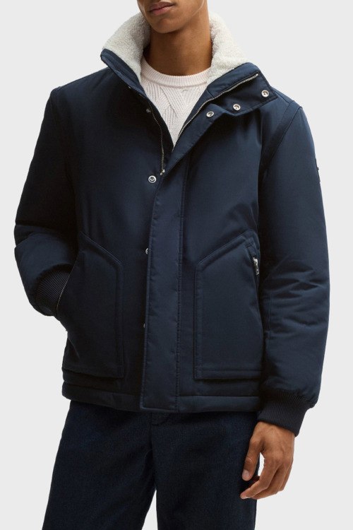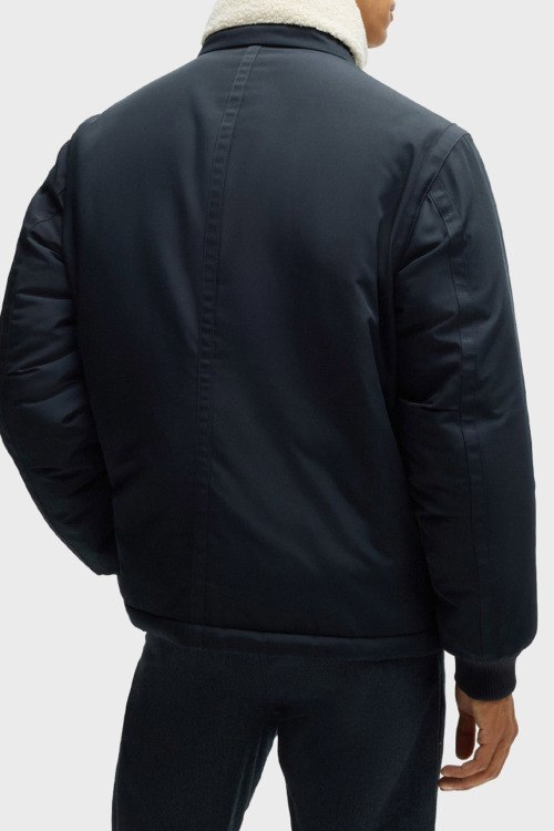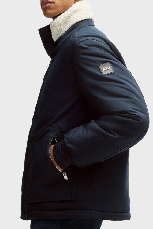 Мужская темно-синяя куртка из полиэстера от Hugo Boss (Хуго Босс). Классическая длина, высокий воротник с меховой вставкой, застежка на молнию и кнопки, прорезные карманы на молнии, патч-лого, модель утепленная синтепоном