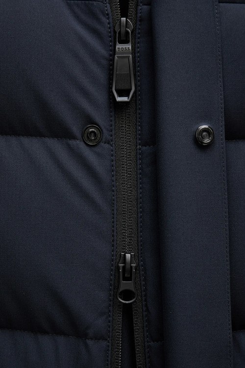 Детали: Мужская темно-синяя куртка на пуху Block-X от Hugo by Hugo Boss (Хуго бай Хуго Босс). Стеганый дизайн, высокий воротник, съемный капюшон, боковые карманы на молнии, карман с логотипом на рукаве, застежка на молнию и кнопки, удлиненная длина, наполнитель из микса пуха и пера