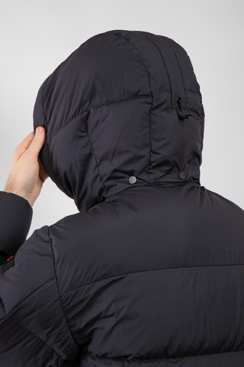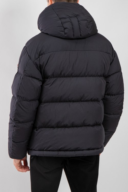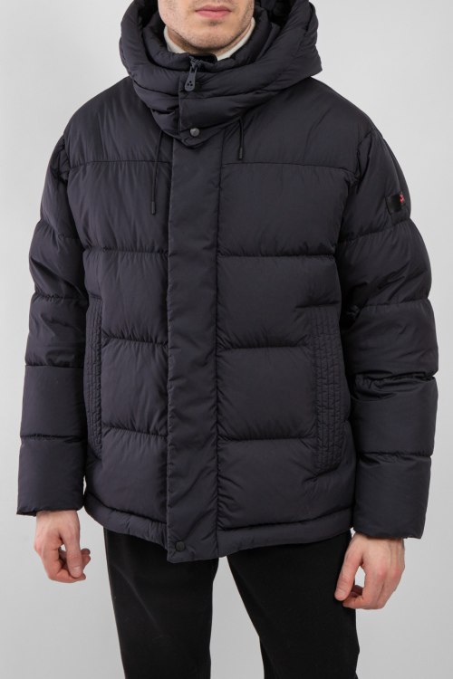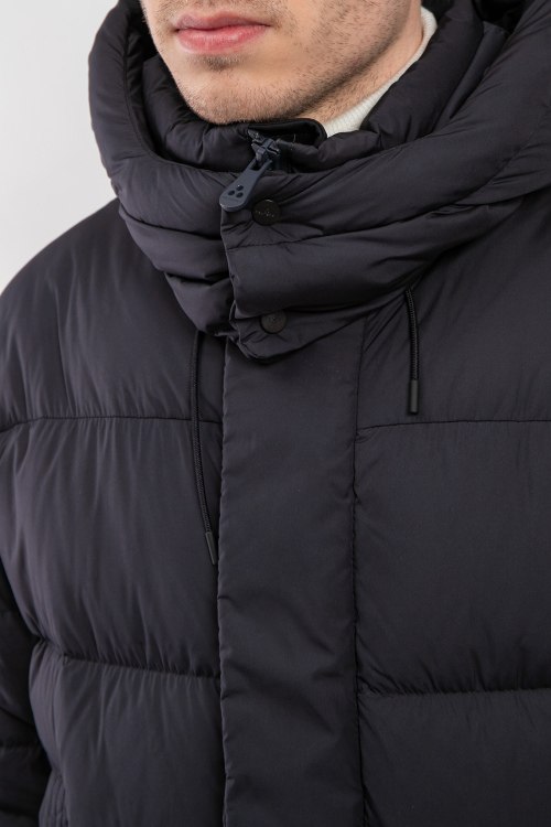 Детали: Мужская темно-синяя куртка из полиэстера от Peuterey (Пьютерей). Стеганый дизайн, застежка на молнию и кнопки, высокий воротник, съемный капюшон, два внешних и два внутренних кармана, модель утепленная миксом из пуха и пера, патч-лого