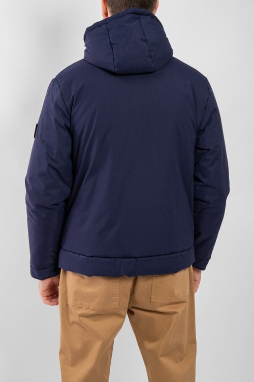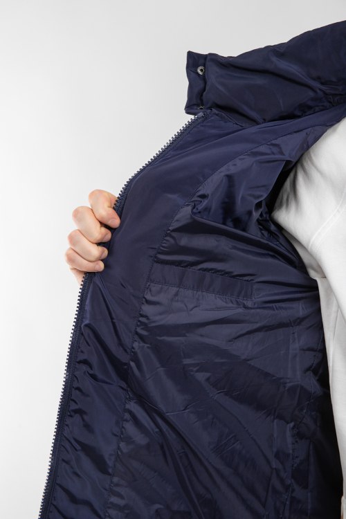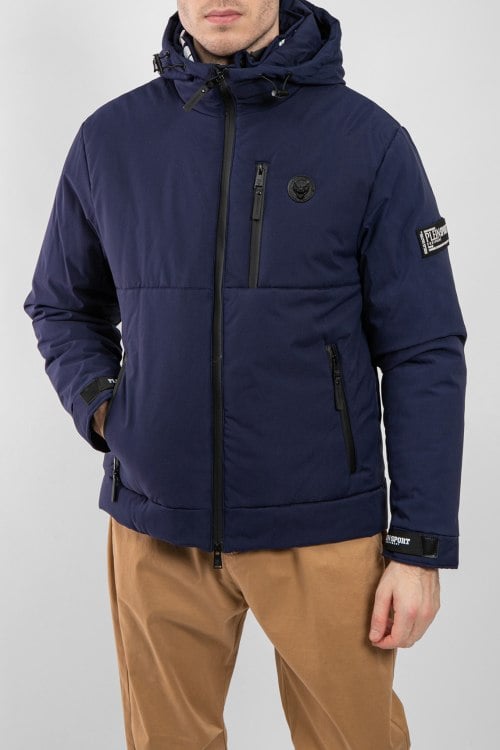 Мужская темно-синяя куртка из полиэстера от Plein Sport (Плейн Спорт). Застежка на молнию, высокий воротник-стойка, вшитый капюшон, дополнительный воротник на кнопках с логотипом бренда, три внешних кармана на молнии, патч-лого на груди, нашивка с лого на рукаве, модель утепленная синтепоном.