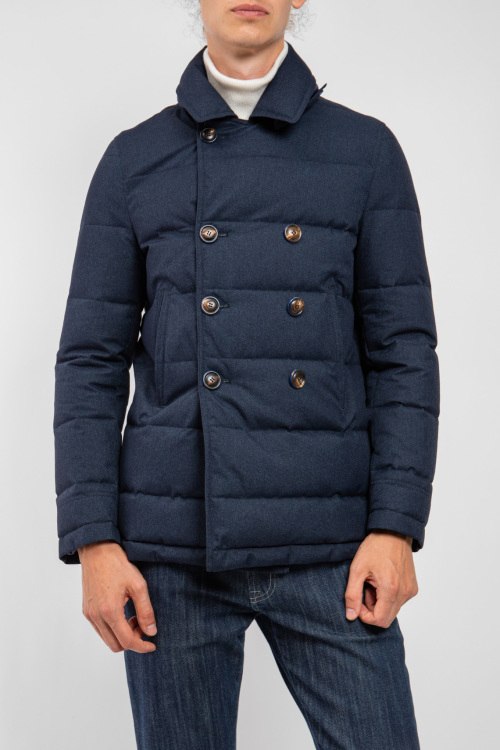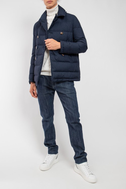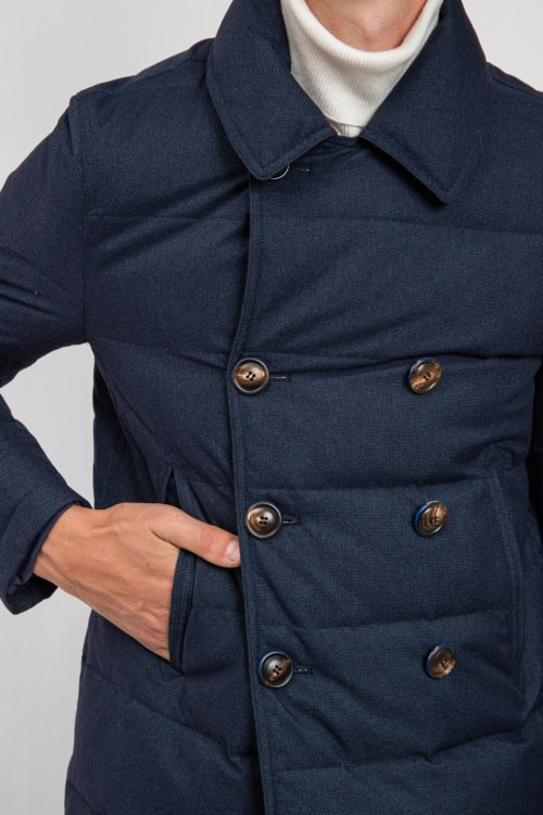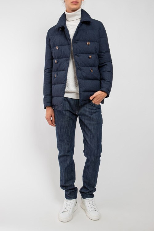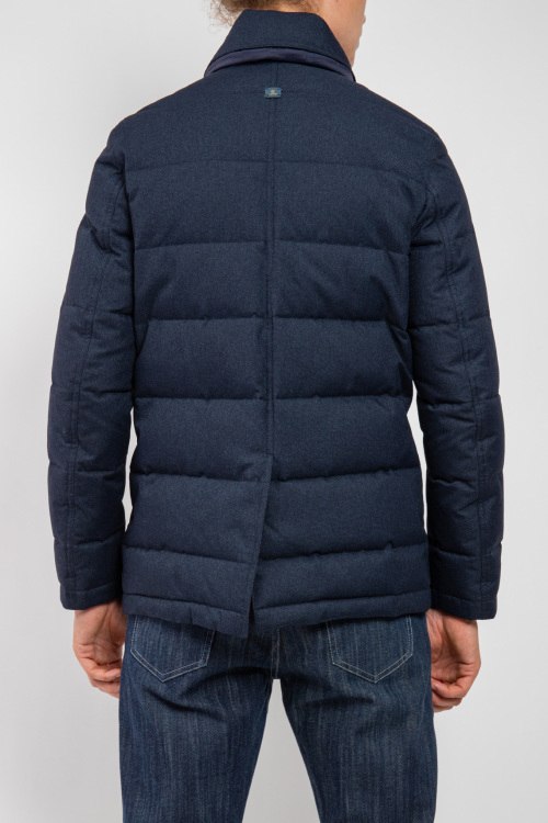 Мужская темно-синяя куртка на пуху от Samas (Самас). Двубортный фасон, стеганый дизайн, отложной воротник, боковые карманы, один внутренний карман, наполнитель из микса пуха и пера. Параметры модели: рост 188, 91-70-92 см. Замеры для размера 50: длина изделия - 68 см; ширина по груди - 58 см; ширина по талии - 54 см; длина рукава по внутреннему шву - 55 / от плеча - 70 см.