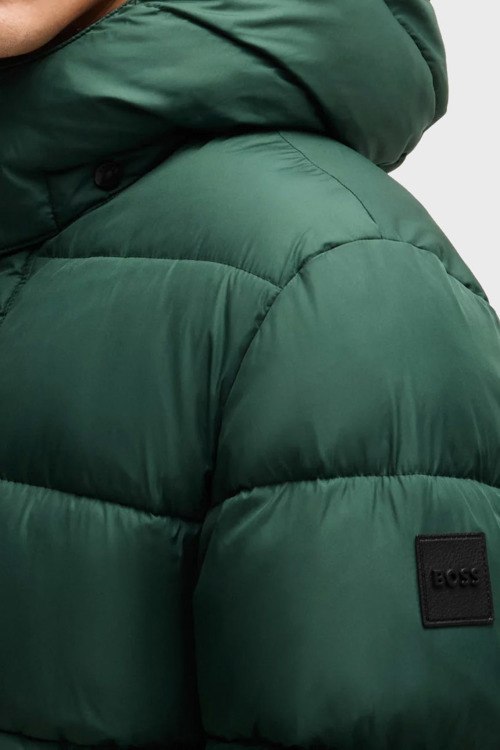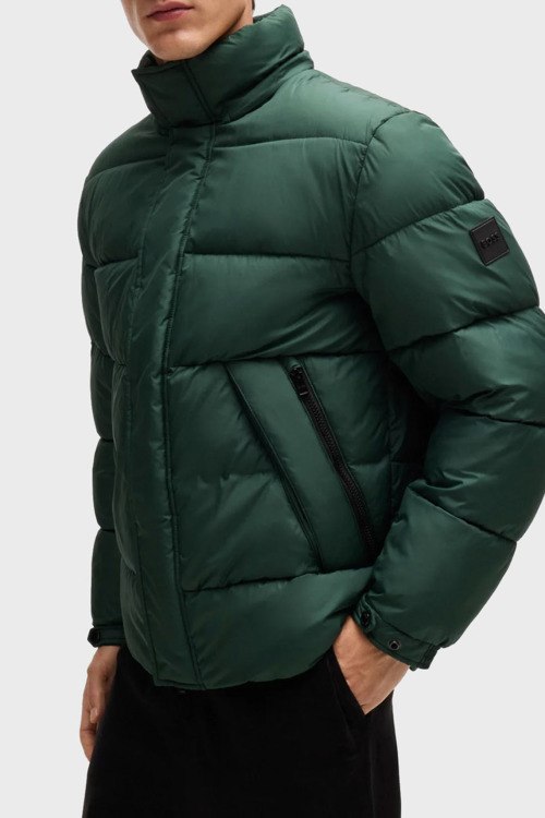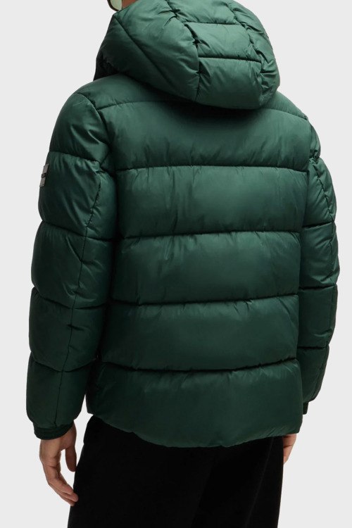 Мужская темно-зеленая куртка H-Corbinian3 из полиэстера от Hugo Boss (Хуго Босс). Стеганый дизайн, высокий воротник-стойка, застежка на молнию и кнопки, прорезные карманы, съемный капюшон, патч-лого, прорезные карманы, модель утепленная синтепоном.