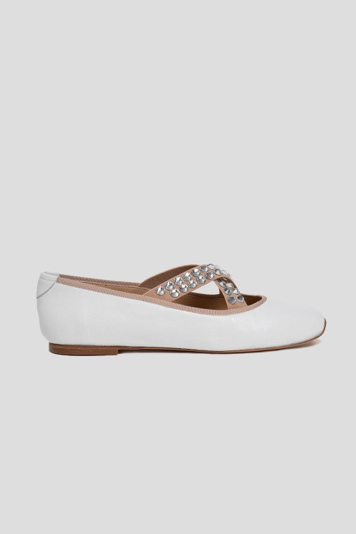 Детали: Женские белые балетки из натуральной кожи от Casadei (Касадей). Закругленный носок, кожаная стелька с логотипом бренда, спереди перекрестные эластичные ремешки с кристаллами