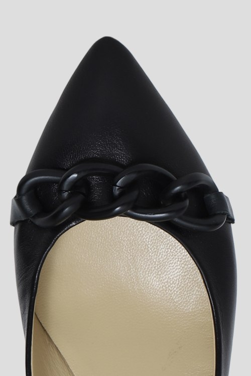 Детали: Женские черные балетки из натуральной кожи от Cristani (Кристиани). Заостренный носок, низкий широкий каблук с металлической вставкой, декор в виде крупной цепочки, плоская подошва