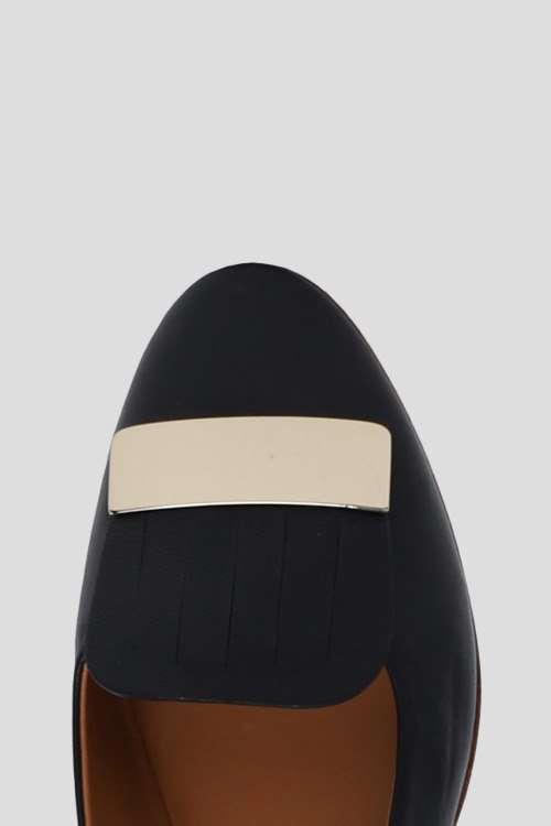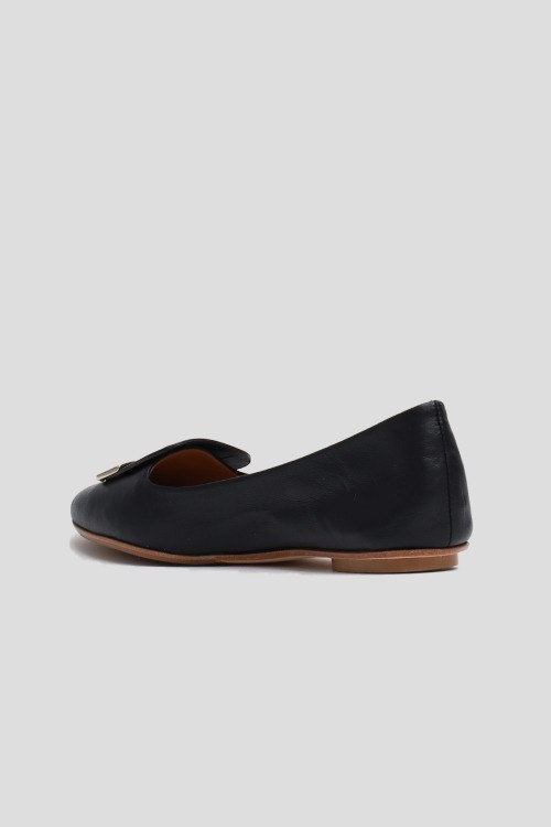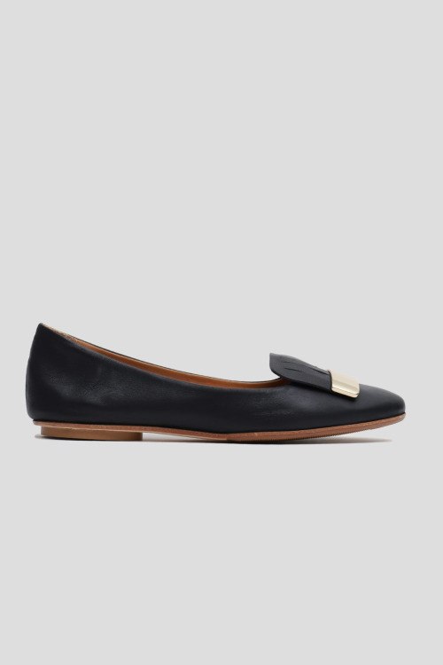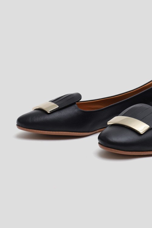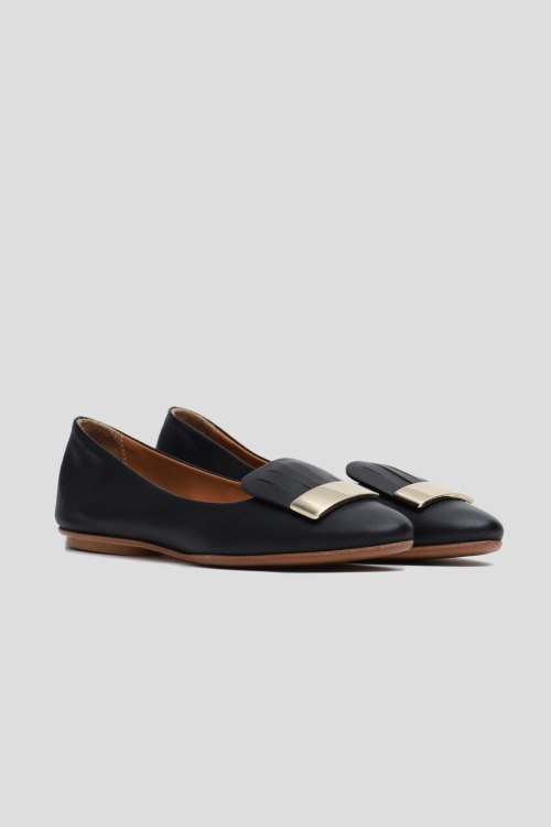 Детали: Женские черные балетки из кожи от Fabio di Luna (Фабио ди Луна). Миндалевидный носок, спереди декорированы металлической вставкой золотистого цвета, плоская подошва, внутри кожаная стелька с логотипом бренда