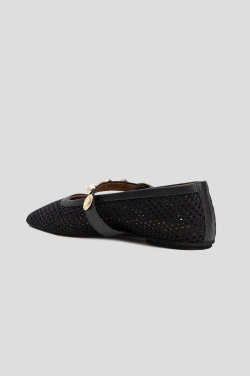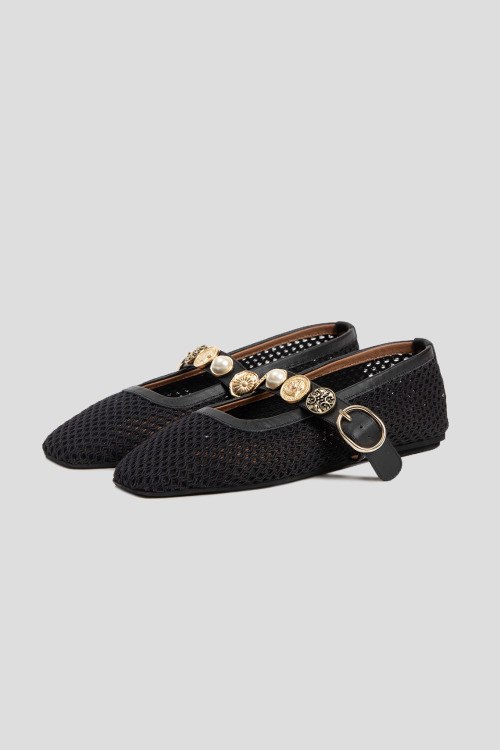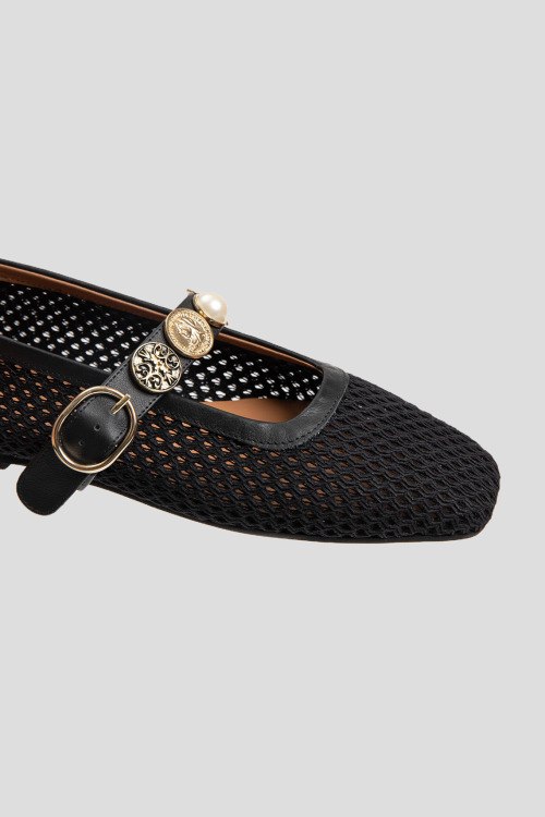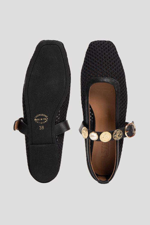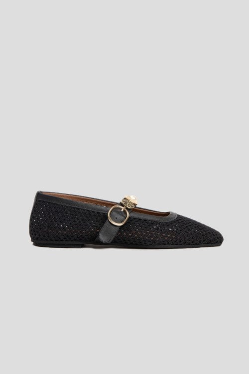 Детали: Женские черные балетки из текстиля от L'Estrosa (Лестроса). Квадратный носок, тонкий регулируемый ремешок с декором, плоская подошва, перфорированный дизайн