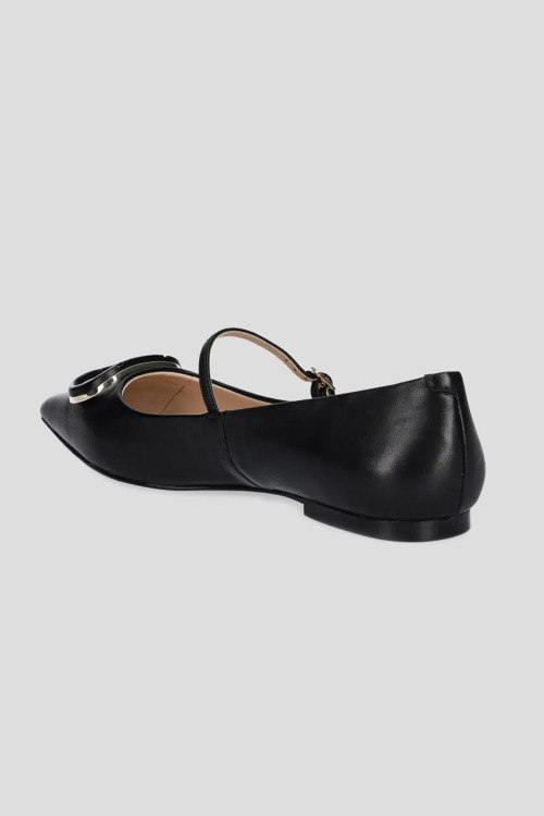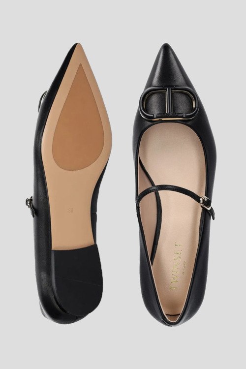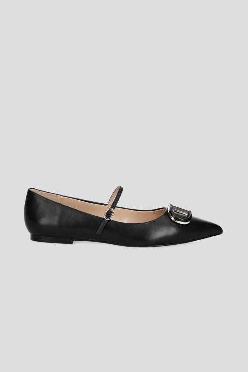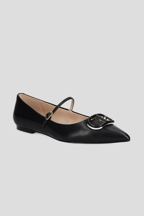 Детали: Женские черные кожаные балетки от TWINSET (Твинсет). Модель из гладкой кожи, логотип Oval T, узкий носок, тонкий ремешок с пряжкой