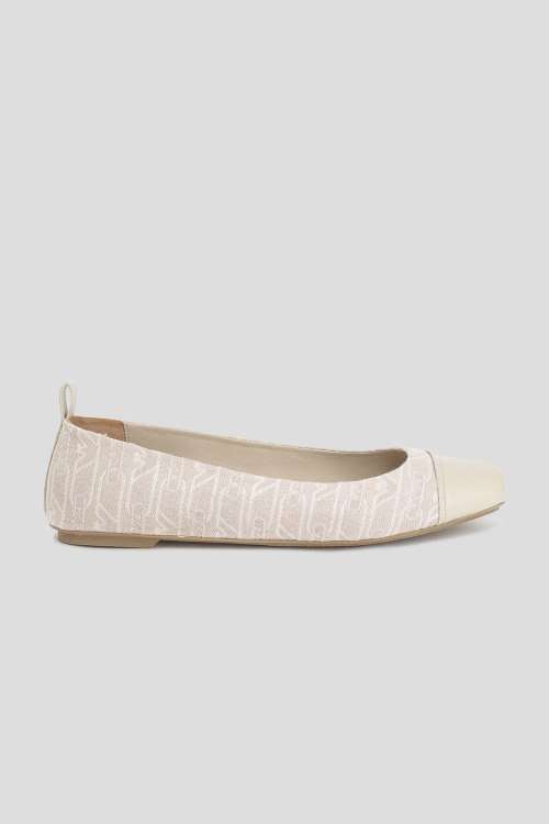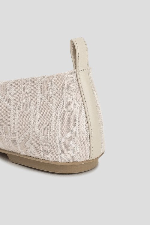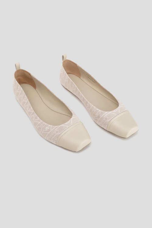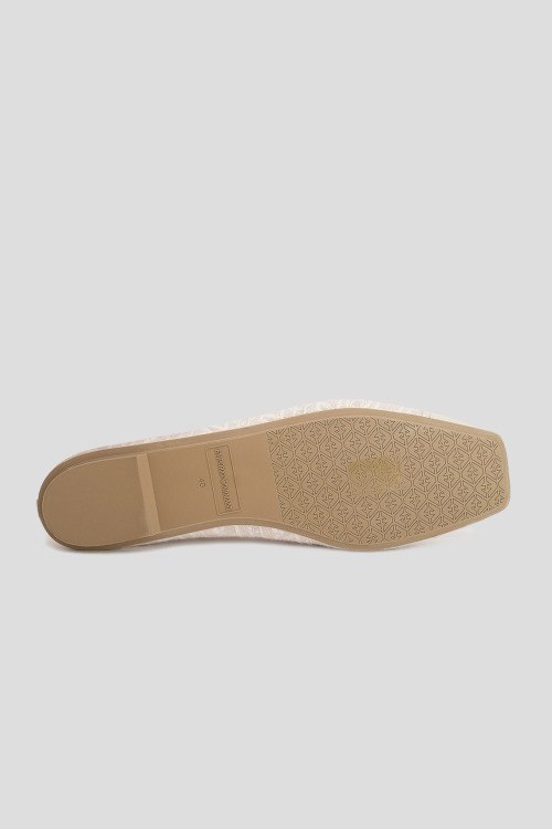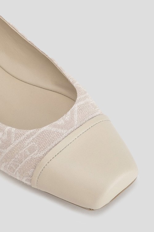 Детали: Женские кремовые балетки из кожи и текстиля от Emporio Armani (Эмпорио Армани). Комбинация материалов, вышитый логотип, квадратный носок, петля для подтягивания сзади, плоская подошва