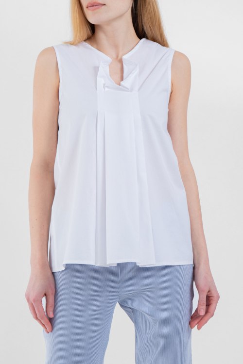 Женская белая блуза из хлопка от Blanca Luz (Бланка Луз). Средняя длина, без рукавов, сзади V-образный вырез, свободный силуэт, спереди декор из драпировки.