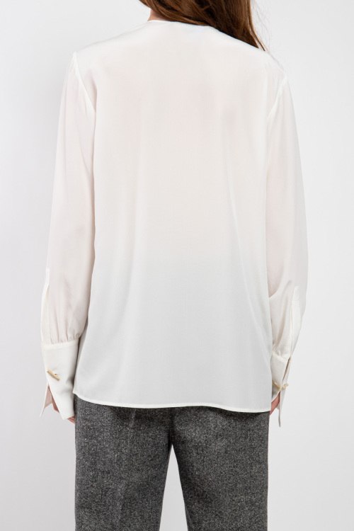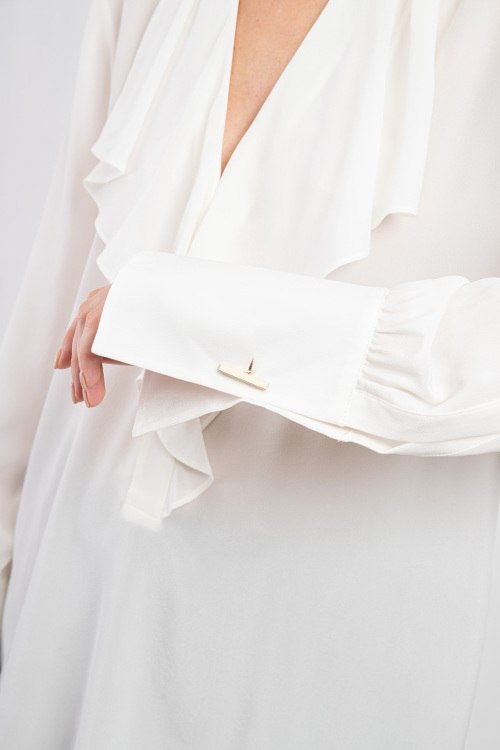 Женская белая блуза из шелка от Max Mara Studio (Макс Мара Студио). V-образный вырез декольте с воланами, длинные рукава, широкие манжеты на пуговице, ровный низ изделия.