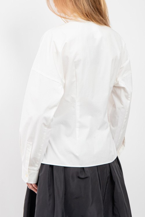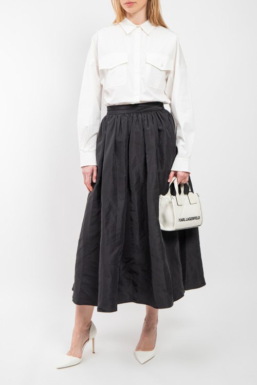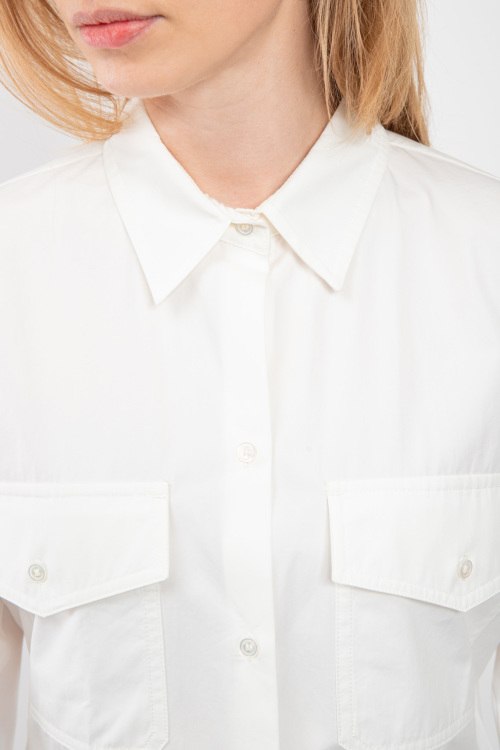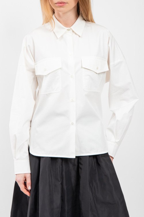 Женская белая рубашка Skipper из хлопка от Max Mara Weekend (Макс Мара Викенд). Классический воротник, застежка на пуговицы, нагрудные карманы с клапаном, по бокам разрезы.
