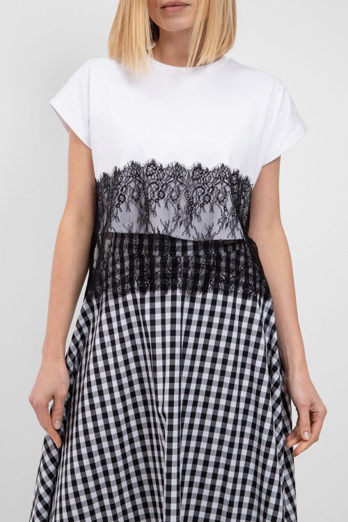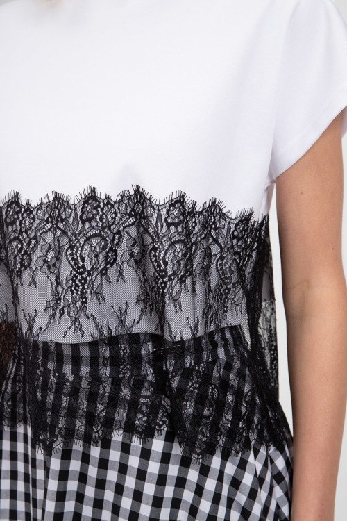 Женская белая блуза из хлопкового микса от Kocca (Кокка). Круглый вырез горловины, укороченная длина, кружевная вставка по низу изделия, короткие рукава, логотип бренда.
