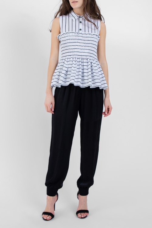 Женский белый хлопковый топ от Pinko (Пинко). Классическая длина, без рукавов, отложной воротник, застежка на пуговицы, эластичная резинка по талии, плиссированный низ изделия.