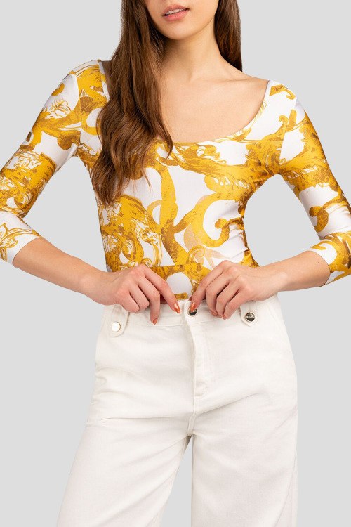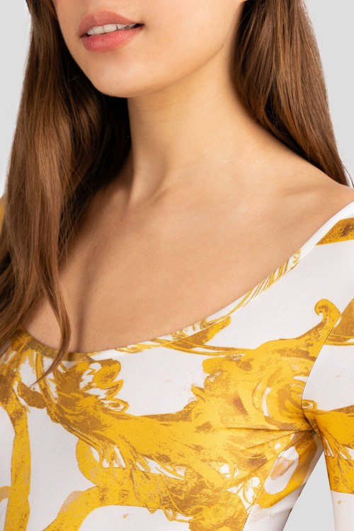 Детали: Женский золотисто-белый боди из полиэстера и эластана от Versace Jeans Couture (Версаче Джинс Кутюр). Облегающий силуэт, дизайн с принтом, укороченные рукава, глубокий вырез горловины, открытая спинка