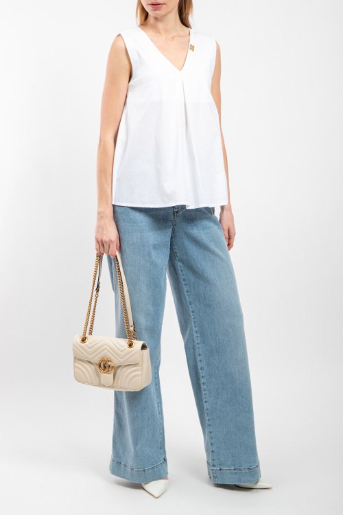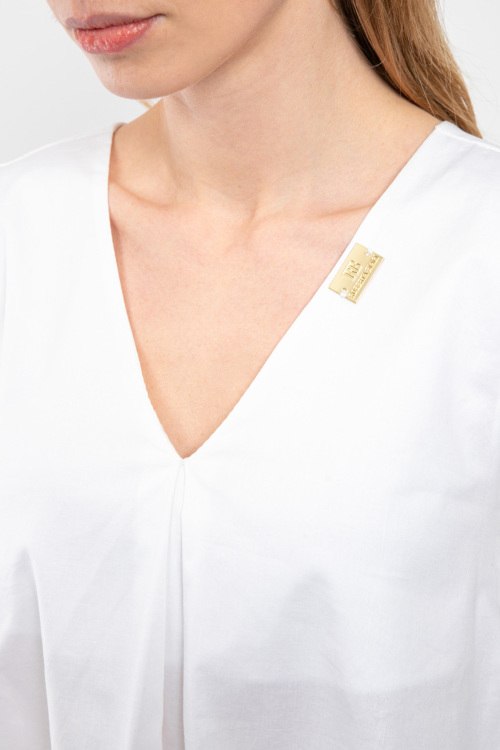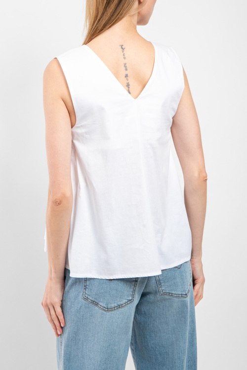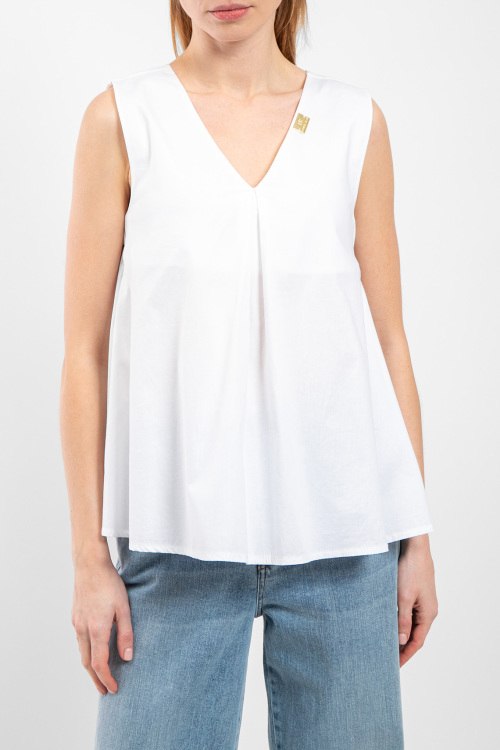 Женская белая хлопковая блуза от Roberta Biagi (Роберта Бьяджи). Модель без рукавов, двусторонний V-образный вырез, металлический значок с логотипом, свободный фасон, классическая длина. Замеры для размера UNI: длина: 60 см, ширина по груди: 44 см, ширина по талии: 61 см.