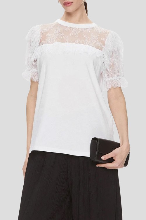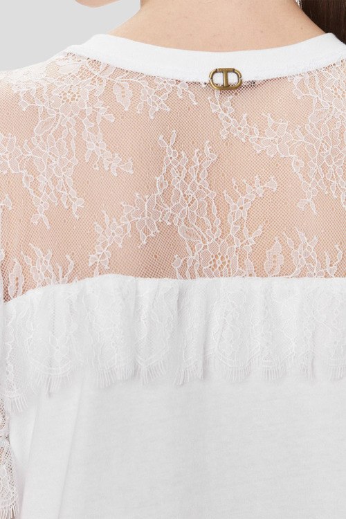 Детали: Женская белая футболка из хлопка от TWINSET (Твинсет). Комбинированный дизайн, круглый вырез горловины, кружевные вставки, короткие рукава, металлический логотип бренда