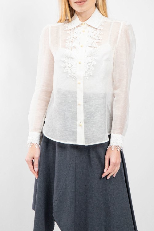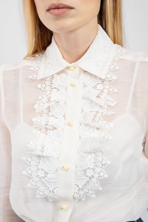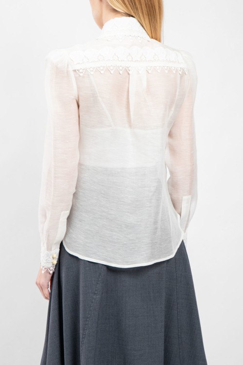 Женская белая блуза из льна и шелка от Zimmermann (Циммерманн). Декор жабо, отложной воротник, застежка на пуговицы, манжеты на пуговицах, классическая длина.