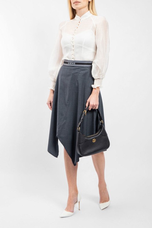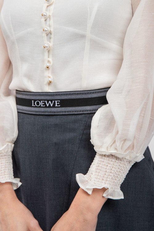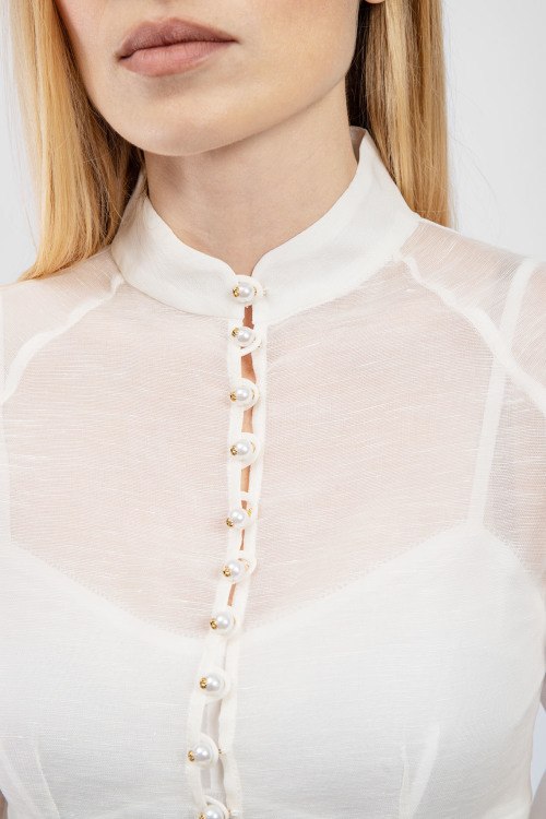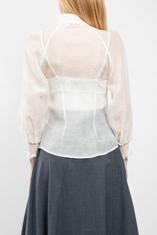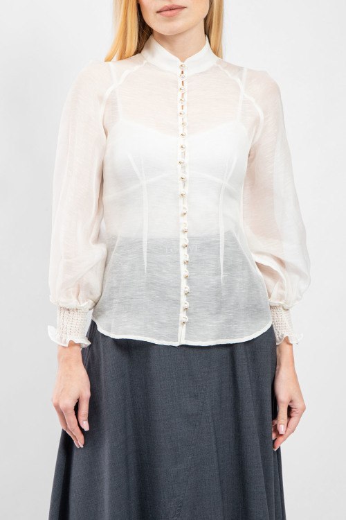 Женская белая блуза из льна и шелка от Zimmermann (Циммерманн). Полупрозрачная модель, воротник-стойка, застежка на жемчужные пуговицы, манжеты на резинке, классическая длина.