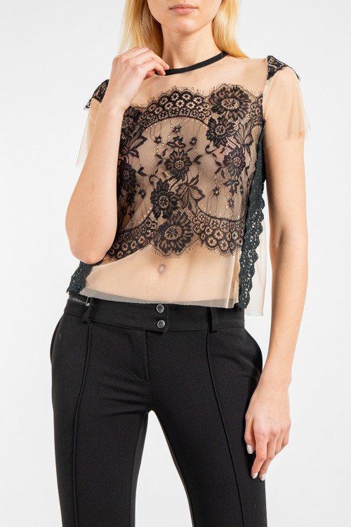 Детали: Женская бежевая блуза из полиамида от Imperial (Империал). Полупрозрачный материал, классическая длина, приталенный фасон, короткие рукава, необработанные края, украшена черным кружевом
