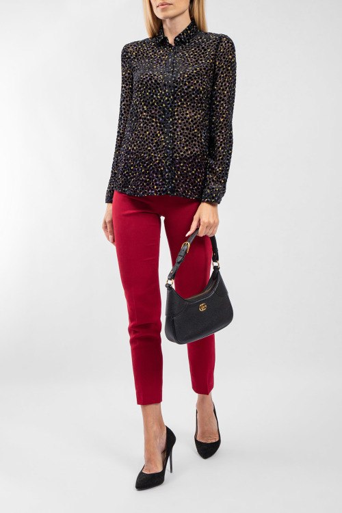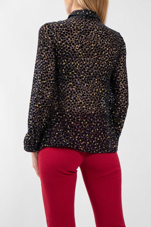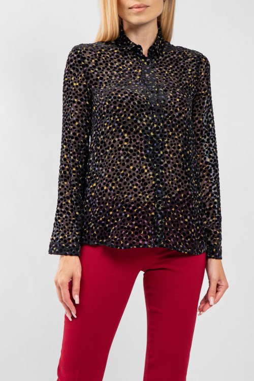 Женская черная блуза из вискозы и шелка от Emporio Armani (Эмпорио Армани). Разноцветный горох по всей поверхности, отложной воротник, застежка на пуговицы, классическая длина.