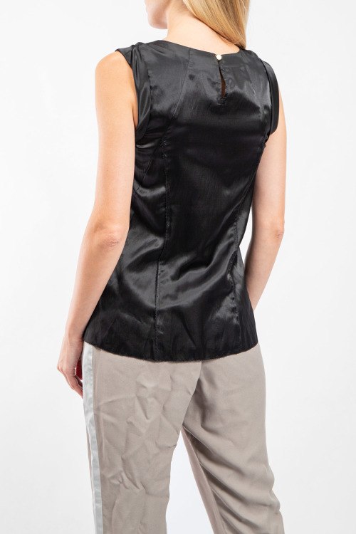 Детали: Женская черная блуза из микса полиэстера и хлопка от Armani Exchange (Армани Эксчендж). Модель без рукавов, классическая длина, круглый вырез горловины, застежка сзади на пуговицу, воланы спереди