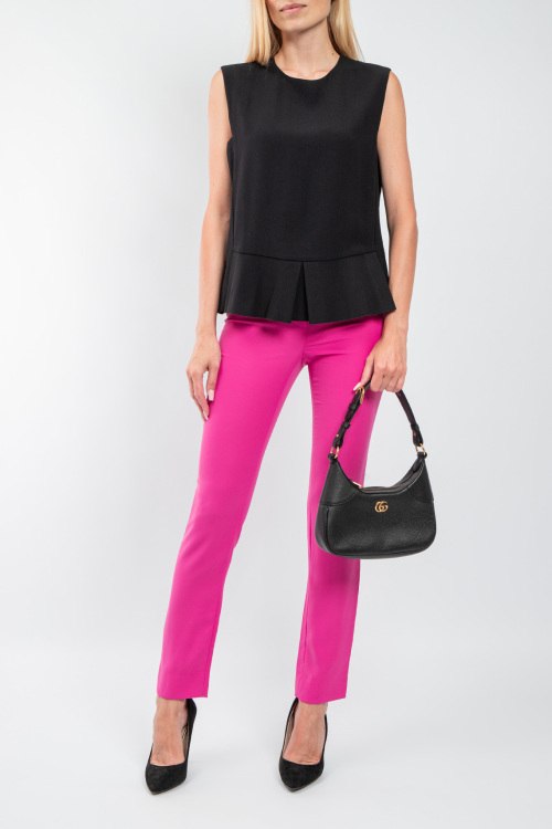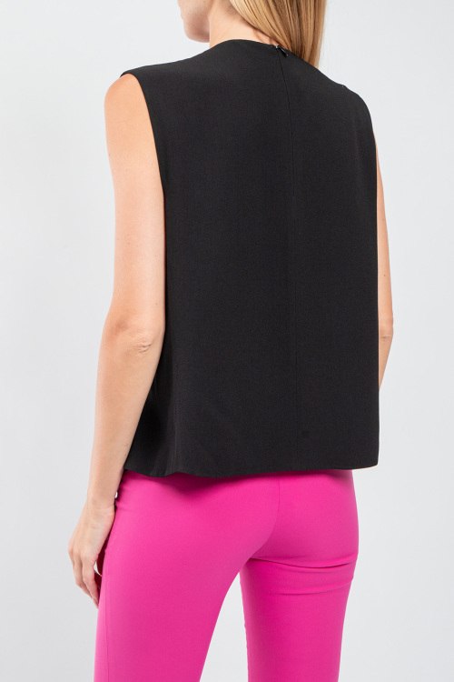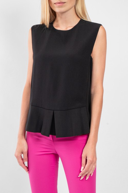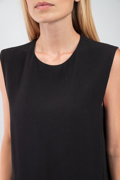 Женская черная блуза от Armani (Армани). Модель без рукавов, круглый вырез горловины, свободный фасон, классическая длина.